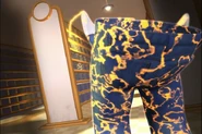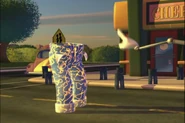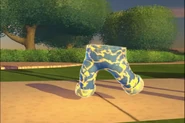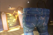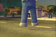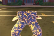 The Smart Pants were made using a pair of Jimmy's jeans which are blue pants with the leg cuffs folded outward, using the inside of their pockets as hands, and have a bright yellow electric charge all over them.
